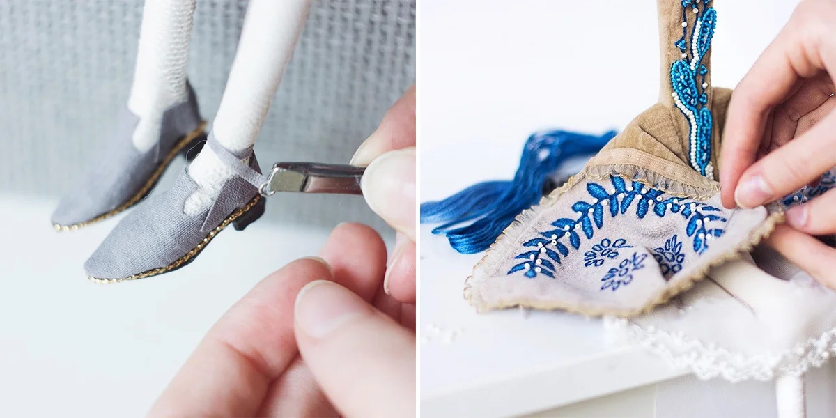In my opinion, costumes not just look great on dolls but give so much character to them. You can tell a whole story with a set of intricate clothing. It’s truly a dreamy process: soft fabrics, complex embroidery, tiny beads and beautiful colours, all come together to compliment the doll you’ve just made. I like to use some antique sewing patterns and merge them together with more contemporary designs. Aways finishing up with embroidery and beading! I really can’t help it when it comes to beads, it’s almost therapeutic to sew them one by one and observe how they glisten in the light.